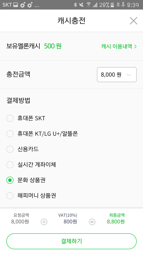 10. 그리고 충전한 멜론 캐쉬 8000원을 이용권에서