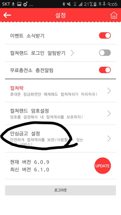 컬쳐랜드에서 설정 모양에 들어가면 안심금고라는