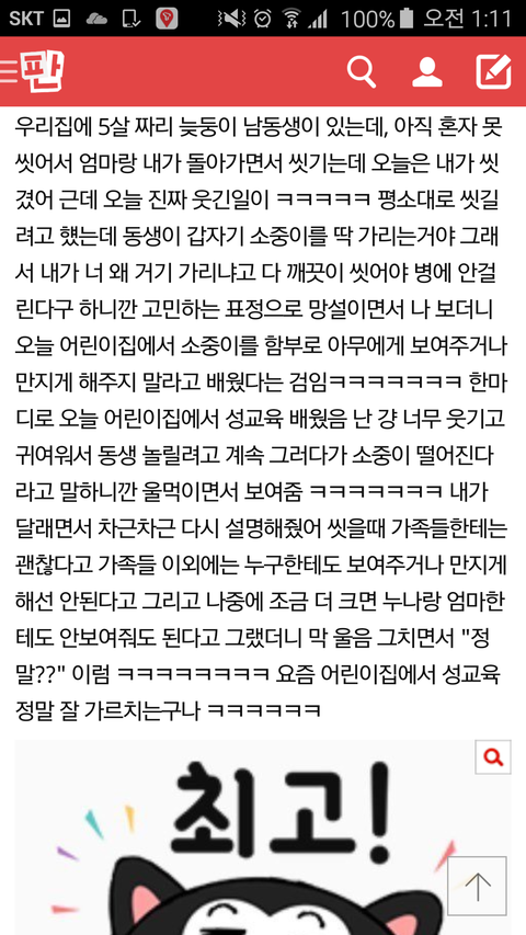 저는 몇달전에 10대판에 나이차이 많이나는 제 늦둥이 5살짜리 남동생을 씻겼던 일화를 올렸다가 성추행범으로 몰렸는데요 정말 너무 어이없고 수치스럽고 화가났는데 정말 시간이 지나고 다시 생각해봐도 저는 동생을 성추행 했다고 전혀 생각 안하거든요? 여기 어른분들이라서 아기있는분들도 계셔서 알겠지만....5살 아직 완전 애기잖아요? 5살 짜리가 혼자서 샤워 가능한가요? 저는 그 글에서는 말안했지만 여기 어른분들이 많이계셔서 밝히는데 저희 아빠는 동생 태어나고 2년후에 교통사고로 돌아가셔서 안계시고 저랑 엄마 동생 이렇게 있어서 동생을 씻겨줄려면 엄마랑 제가 돌아가면서 씻겨야 하거든요 엄마혼자서 씻기면 힘들어서 제가 도와주는데.....이게 정말 성추행인지 어른분들이 보셨을때는 어떤지 판단쫌 해주셨으면 해서 이렇게 글 남깁니다.