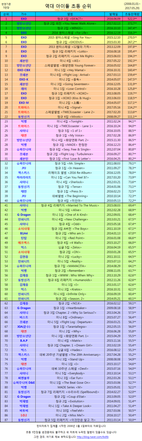 이게 역대 아이돌 초동 순위야. 저거 하나로 팬덤 화력이 측정되는 거야 공카 회원수 유료 팬클럽 회원수 이런 거 보다 일주일 안에 판 앨범 갯수가 훨씬 중요해 2008년도부터 줄세우기로 평생 박제되는 거고 애들 평생 따라다닐 수치야 이번 데뷔 앨범이 끝이 아니니 다음 앨범도 다다음 앨범도 아마 있을테지만 >>>이번 데뷔 앨범 초동은 이번이 끝이