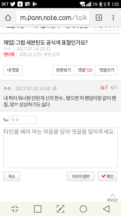 얘들아 이런 댓글 보면 정화하자 타팬은 관심 갖아주지 말라고 세븐틴이랑 워너블이랑 해결 할테니깐 머글이면 조금만 기다려 달라고 그리고 팬톡과 협의 하지 않은 글이라고 댓글 달고 오자...... 내가 이 댓글 달려고 하는데 어때 ??? 싫음 말해봐