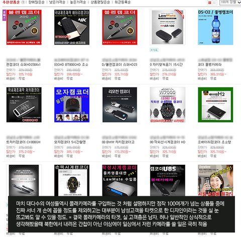 몰래카메라를 구입하는 구매자의 비율은 현저히 여성보다 남성이 높으며 자신의 신변을 보호한다는 이유로 몰래카메라를 구입하는 여성은 지극히 극소수에 달하며 요즘같이 CCTV나 가정용 카메라가 버젓이 공용화되고 있는 이 시점에서 몰래카메라의 용도는 굉장히 제한적이고 한정적인 용도로 밖에 사용되고 있지 않습니다. 본인이 북한 간첩이 아닌 이상에야 일반 평범한 가정집에서 누군가를 몰래 들키지 않고 촬영해야 하는 몰래카메라는 더 이상 필요하지 않다는 결론을 내렸습니다.