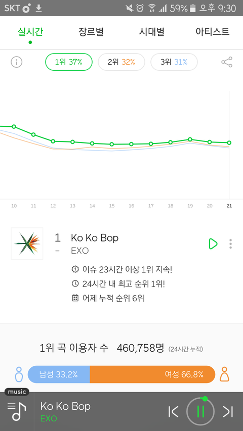첫날 50몇만에서 빠지다가 조금씩빠지아 45~46만정도 몇시간전부터 유지하는거보면 듣는사람은 계속듣는듯 더 많이 들을수있게 계석1위올려놔야함 엑소믿거하는사람들도 듣게만들라면