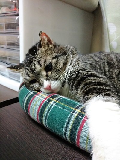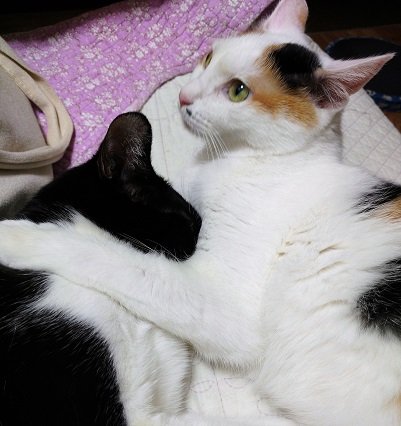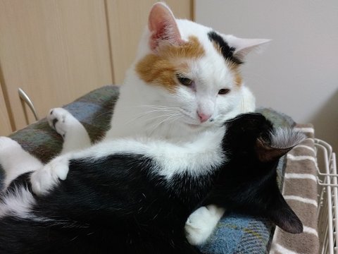 새로운 쿠션을 나나에게 줬더니 질투하는 퐁타. 자리 싸움이 났습니다. 비집고 들어가겠다는 퐁타와 비키지 않겠다는 나나.