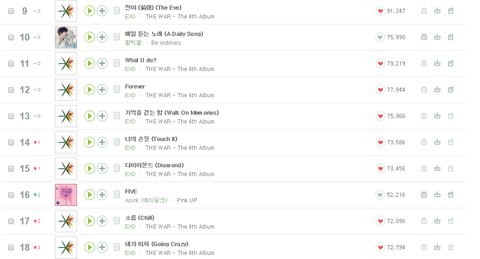 10위권에서 수록곡 줄세우기 하고있음ㅋㅋㅋㅋㅋㅋㅋㅋ 개오졐ㅋㅋㅋㅋㅋㅋㅋㅋㅋㅋㅋ 이거 7시 퇴근차트 맞고요~ 수록곡 싹 올랐구요~ㅋㅋㅋㅋ