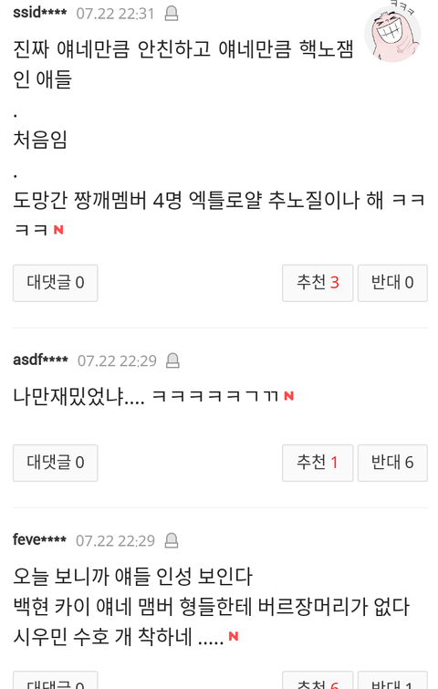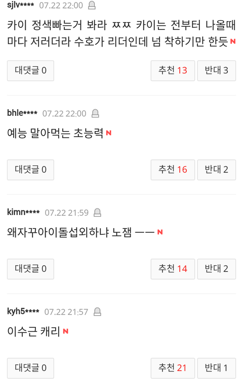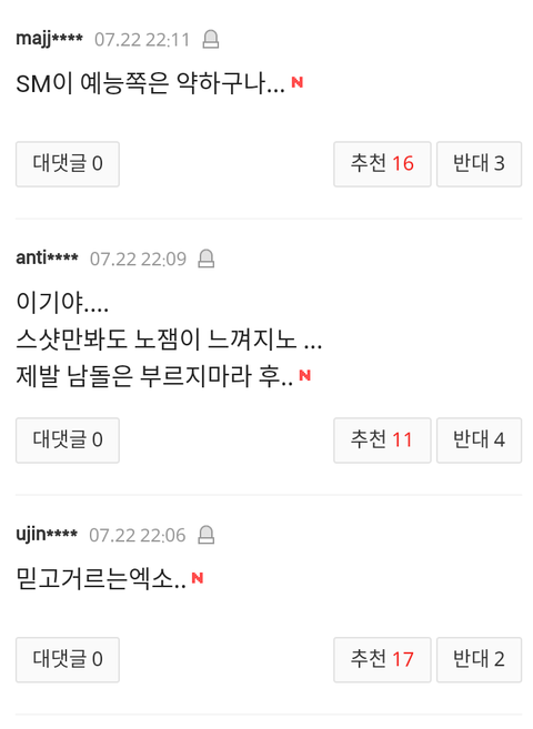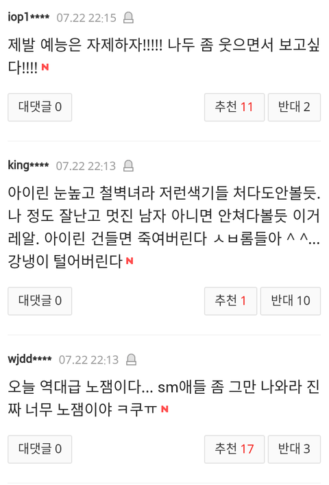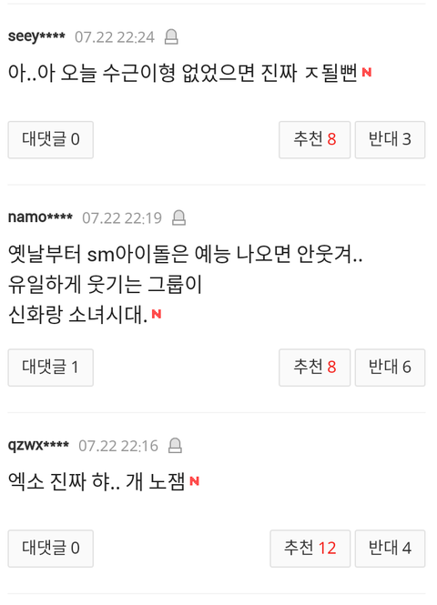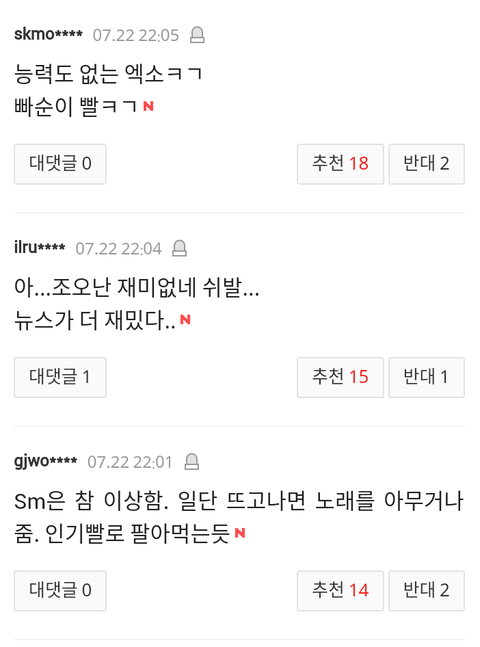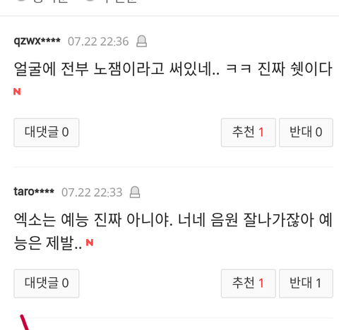 요즘들어 엑소 기사가 네이트에 올라오면 완전 불가촉 천민 취급하면 온갖 막말들로 뒤덮이는데 이게 지금 정상? 대체 엑소가 뭘잘못했는데 이런 개같은 대우를 받아야하냐? 뭐하나 기록을 세우고 업적을 세우면 칭찬은 깎아내리는것도 모자라 이젠 아예 살아가면 안되는 인간말종 취급을 해?원하는게 뭐냐? 엑소가 그냥 이세상에서 사라져주는게 니들이 원하는거야? 니들이 사람이냐? 짐승들도 니들보단 더 낫겠다. 이젠 팬으로써 나도 참을수 없어서 여기다 끄적여본다.팬빨? 팬빨이라고 치자 그럼 니들은 너희가 좋아하는 가수나 연예인에게 뭘해주었냐? 우린 엑소를 인정하게 하려고 노력이라도 하지 니들은 하는게 뭐냐? 열폭이야? 와 진짜 인간말종들 진짜.이젠 하다하다 인종차별까지 하냐? 그따위로 인생살지마라. 그게다 부메랑 된다. 더이상은 나도 못참는다.