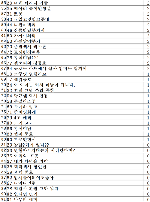 여기 54등까지 살아남앗어 이번에는 55부터는 표가 같아서 다탈락으로 했어