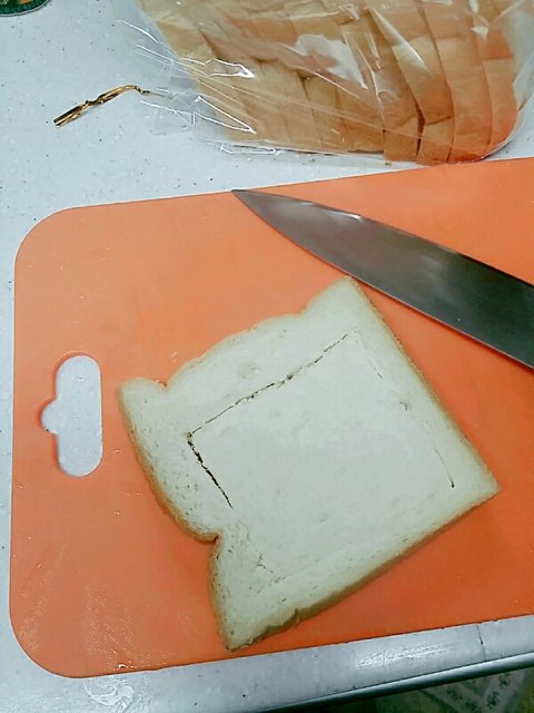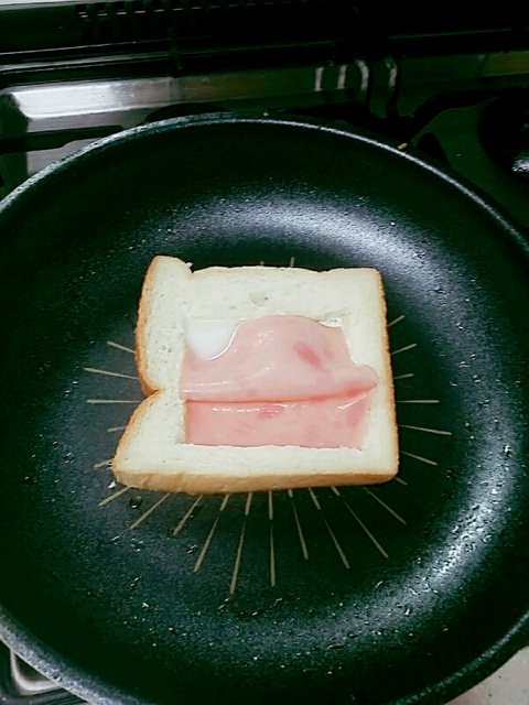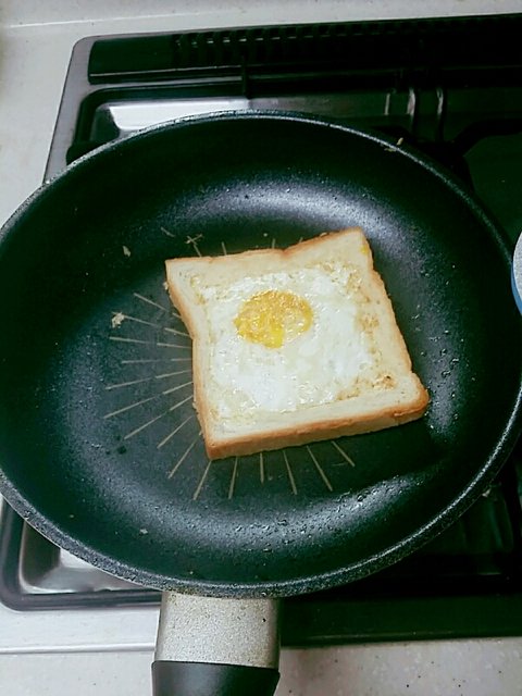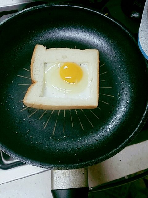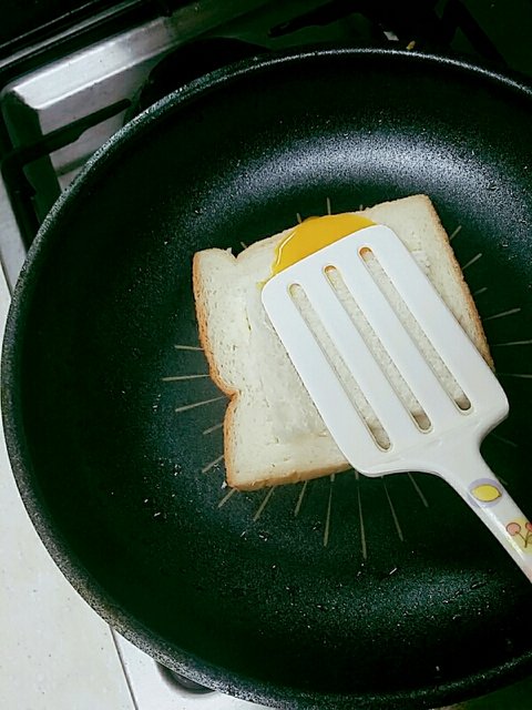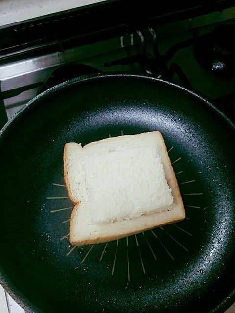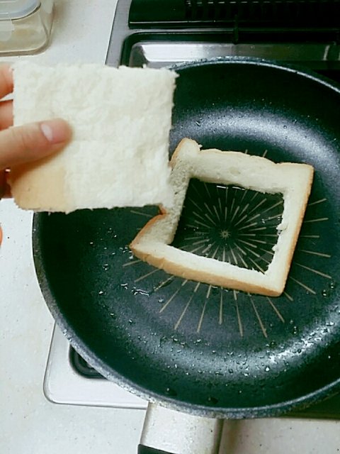 2.후라이팬에 속이 빈 식빵을 먼저 구워줘.기름은 식빵 굽기전에 후라이팬에 두르기!