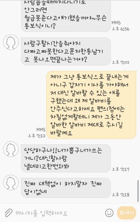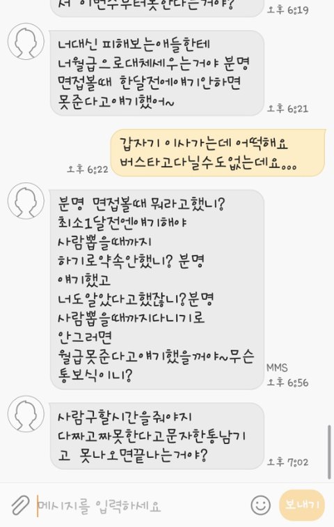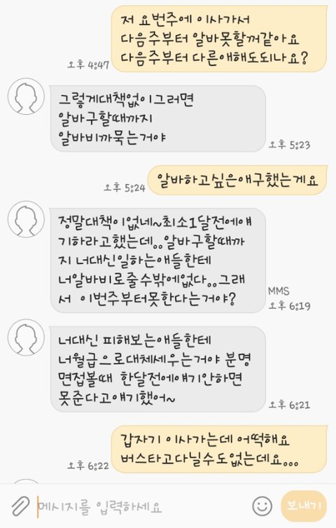 cu에서 알바하는 알바생인데요 글쓰는건 처음이라 어떻게 해야될지모르지만 이해부탁드립니다 제가 다음주에 이사를 가서 알바를 못하는데 지금 살고있는데는 집이랑5분거리거든요 이사가면 버스타고30분을오고가고해야되서 알바한다는 애를구하고서 다음주부터해도되냐고물어봤는데 밑에 사진처럼 왔습니다 제가잘못한건알고있습니다 조언좀해주세요ㅜㅜ
