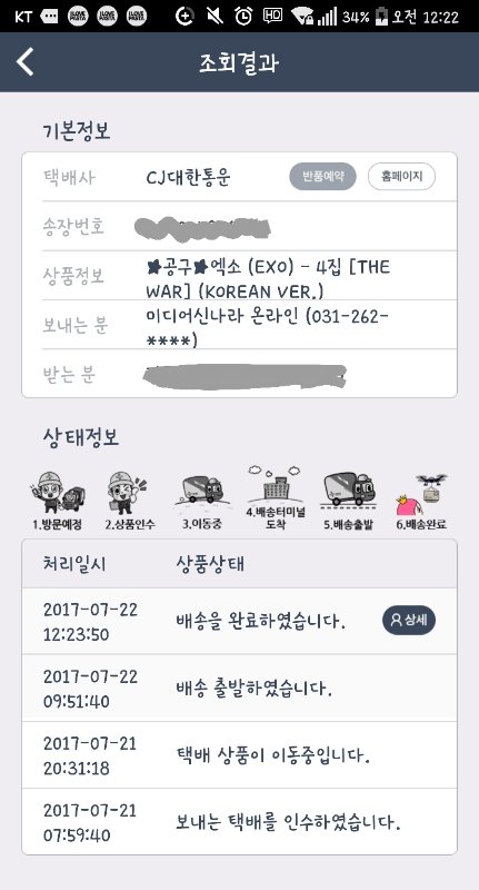 CJ대3한통1운 앱 깔고 본인인증하고 로그인 한 담에 들어가면 배송내역 뭐 뜨는거 있을거임. 그거 누르면 밑에 사진처럼 배송정보 알 수 있음.