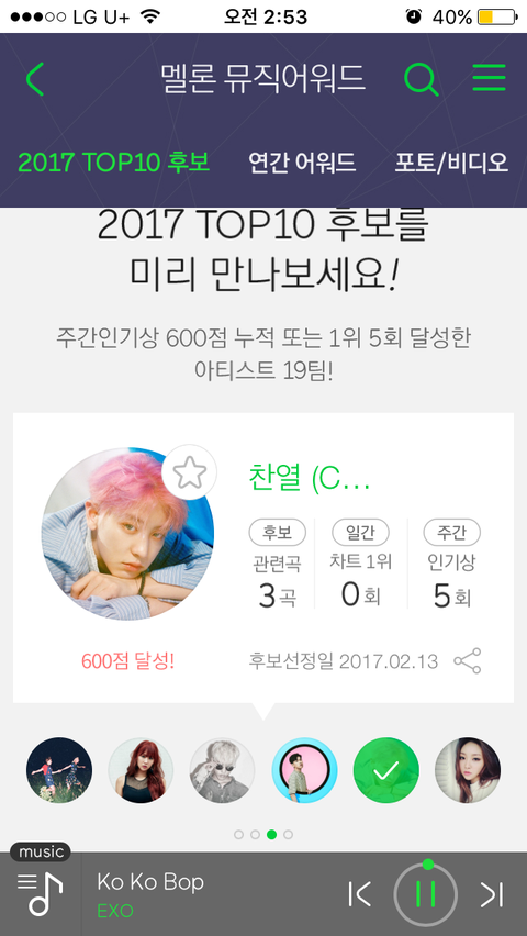 저거 후보에 꼭들어야 멜론탑텐안에 드는거 알지..스밍잘해야해ㅠㅠ 진짜 급한데 시간이 없음.... 그와중에 박찬열 40등까지 뽑는거 안에 이미 달성해서 들어있엌ㅋㅋㅋㅋㅋㅋ