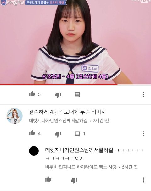 겸손하게 4등 ㅋㅋㅋㅋㅋㅋㅋ 유정이처럼 실력좋으면 말을 안하지.. 체력제외하고 보컬이나 댄스나 뒤에서 2등 하는애야