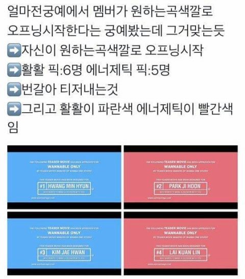 이거 ㄹㅇ맞는듯 애초에 노래나올 때 파란 띠 빨간 띠 나올 때부터 이상했어 .. 활활 노래 좋은가봄.!? 근데 저거 고른거 되게 의외임 ㅋㅋㅋ민현 재환 빼박 에너제틱일줄 알았는데