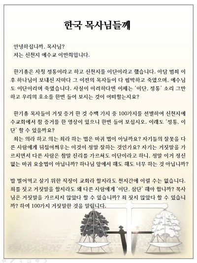 그러함에도 자기들의 죄는 회개하지 않고 교인 수의 급감의 원인이 신천지의 급성장 때문이라고 억지를 부리고 있습니다.