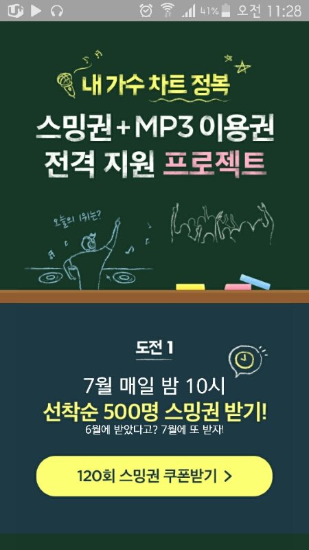 이거 네이버뮤직 이벤트 ? 같은건데 매일 밤 10시에 선착순 500명안에 들면 스트리밍 120회할수있는거 줘 !! 멜론이랑 네이버뮤직 둘다 스밍돌리면좋잖아^^