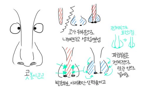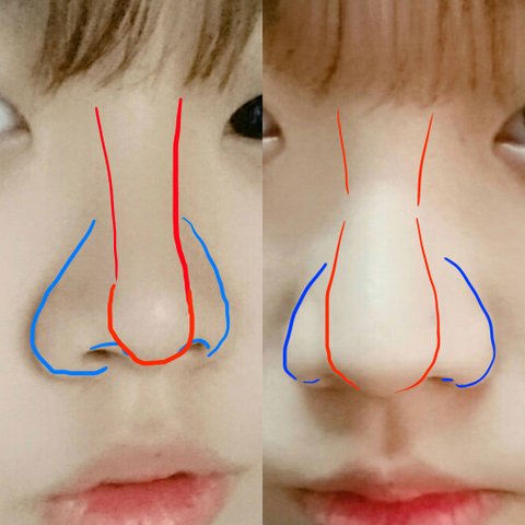 한마디로 하자면 코 한쪽을 그림자지게 만들라는거 !