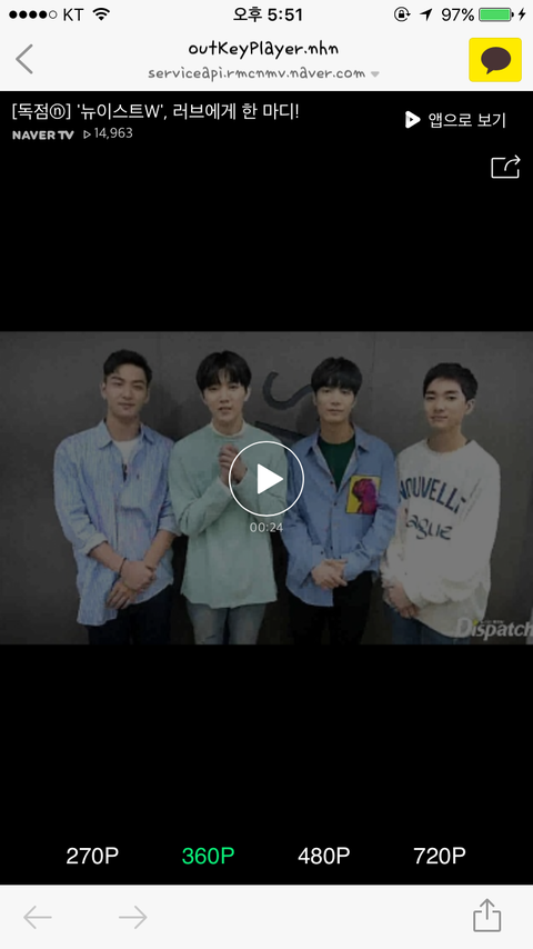 http://serviceapi.rmcnmv.naver.com/flash/outKeyPlayer.nhn?vid=2EBDA696FA4636E9635BEC86B677B9F02842&outKey=V12129786f9712681e6d06adfd10800810e817079c4ace8e9ffff6adfd10800810e81&controlBarMovable=true&jsCallable=true&isAutoPlay=false&skinName=tvcast_white&width=300&height=169#하..사랑해 동호 ㅜㅜ