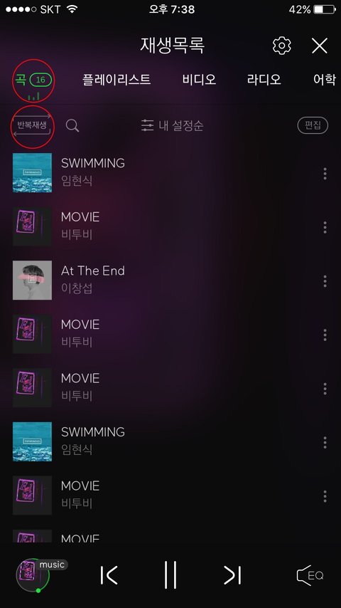 5.재생바는 건들지 말고 혹시라도 듣다가 멈췄으면 듣고 있던 노래 처음부터 다시 들으면 돼