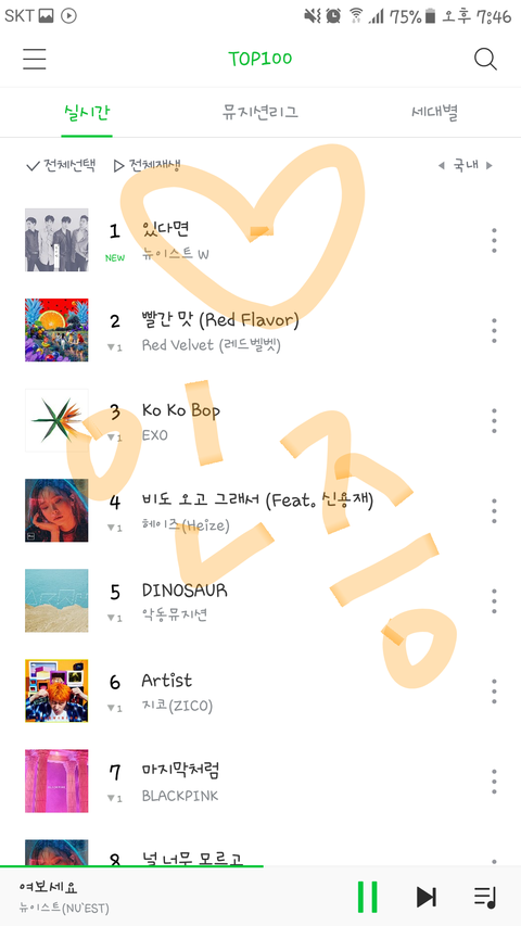지금 초록창 뮤직앱에서는 우리 뉴이스트W 1위다아~~