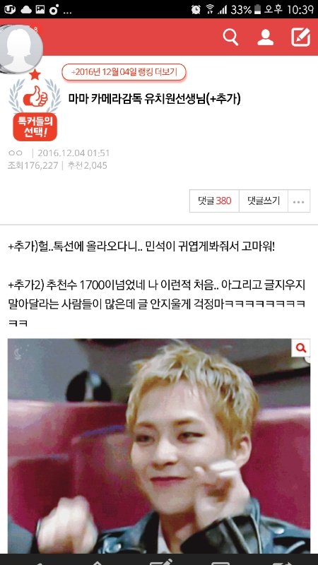 뿌듯함 추천수 2000넘고 ㅅ1발 짜릿해 우리 민석이 귀여움을 알렸다..