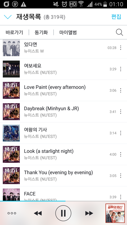 팬톡 눈팅 중에 자주 봤던 러브페인트,여왕의기사,잠꼬대,데이브레이크 등등 한 20곡 들어보는중야ㅎㅎ