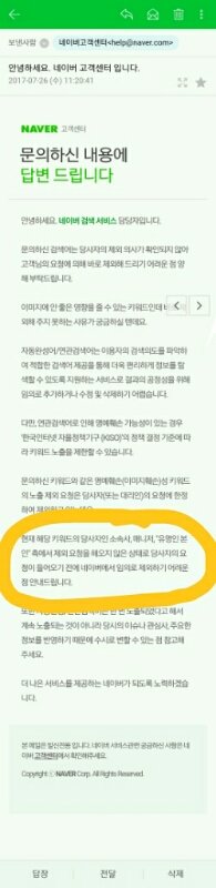 어제 초록창 연관검색어 우현이 뜨는거 신고했는데 메일로 이렇게 오던데 오늘 없어진거보면 소속사에서 요청 했나봄 울림이 일한건가..?