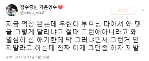 오늘 먹방가신 팬분 피셜임 ... 진짜 가족들 다 알잖아 ㅠㅠ...우리 우현이도 충분히 마음아프고 힘들텐데 그 가족은 또 어쩌겠냐고 ... 망할 토르 오른손 망치로 뚝배기 다 깨버릴 기레기랑,키보드워리어들...;