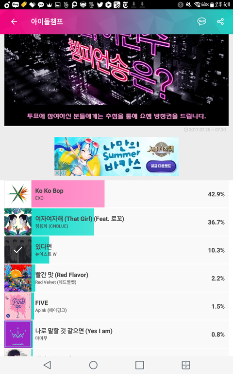 아까 10.4% 였는데 지금 조금이지만 아까보다 투표 비율이 떨어졌어ㅠ 어제 가위앱때 애들 1위 하고 싶단 말 다들 기억하지??ㅠㅠ ㅇㅅ분들이랑 ㅈㅇㅎ분이 넘사벽이라 해도 한 사람당 3번 투표 가능하니까 지금 러브들 화력이라면 충분히 올릴 수 있어 투표 안 한 러브들 쇼1챔 앱 깔아서 투표 부탁할게
