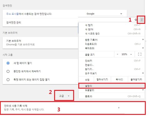 메뉴(점세개) -설정-고급-인터넷사용기록삭제