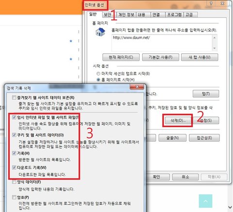 모니터 맨위 메뉴- 도구 - 인터넷옵션 - 삭제 -기록삭제