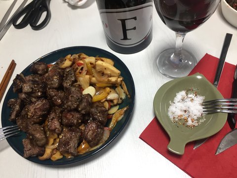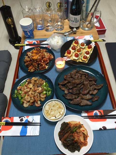 이것도 식구들 놀러왔을 때 새우 볶고 고기 굽고 후다닥 차려낸 술상이예요. 너무 술안주 위주여서 민망;
