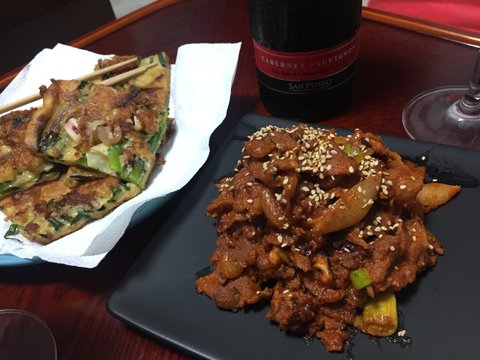 제육볶음이랑 파전이예요. 제육에도 표고버섯 썰어넣으면 식감도 좋고 향도 좋아요.