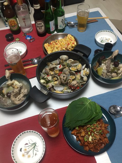 가족들 놀러와서 바지락술찜에 왕계란말이, 제육볶음 만들어서 포차 분위기를 내 봤어요. 이 다음날이 초복이라 엄마표 닭백숙도 함께했어요.