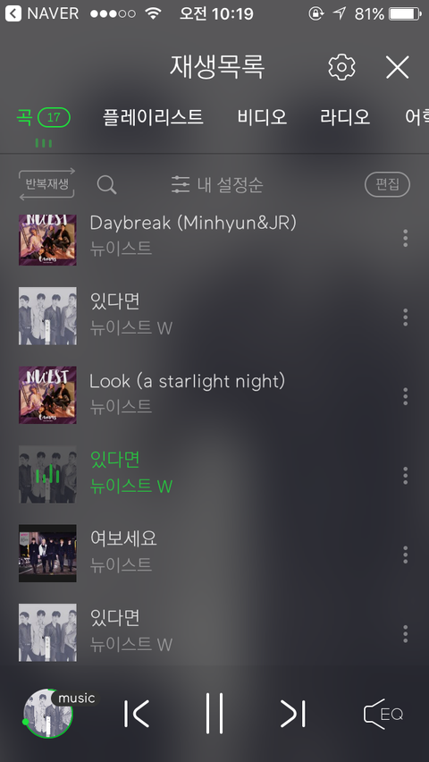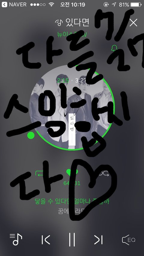 어제 미용실가서 소리안틀고 스밍했는데 그분이 내 재생화면 보시더니 뉴이스트 좋아하냐거 물어봤었음 그래서 맞다고했더니 자기도 러브라고 했다꼬 그래서 크리닉도 꽁짜로 해줬다꼬 엄청 신났음 머리 4시간동안하면서 뉴동이들 얘기만 주구장창해서 4시간이 40분같았어 ㅎㅎ 기분좋아 ❤️
