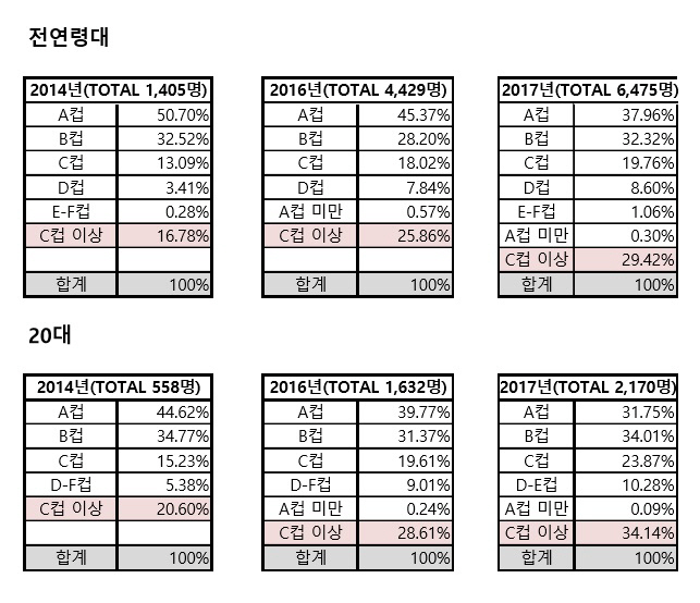 전연령대 여성 가슴 사이즈 중 C컵 이상은 2014년 16.78%, 2016년 25.86%, 올해 29.42%였다. 이중 20대 여성의 데이터만 따로 추려 다시 통계를 내봤다. C컵 이상의 비율은 2014년 20.60%, 2016년 28.61%, 2017년 34.14%였다. 해마다 비율이 높아지고 있는 것을 알 수 있다.