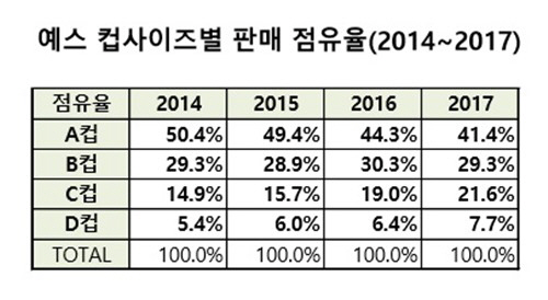 매장에서 실제 무슨 컵사이즈가 많이 판매되느냐 역시 이 같은 통계를 뒷받침해줄 수 있을 것이라는 생각이 들었다. 좋은사람들이 운영하는 브랜드 중 20대를 타깃으로 하는 예스 전국 매장에서 2014년부터 올해까지 판매된 컵사이즈 비율을 알아봤다. 하지만 20대를 타깃으로 했다고 해도 꼭 20대만 이곳에서 속옷을 사라는 법은 없다. 전연령대가 이용할 수 있지만 그중에서 젊은층 비율이 높은 브랜드를 선택한 것이다.