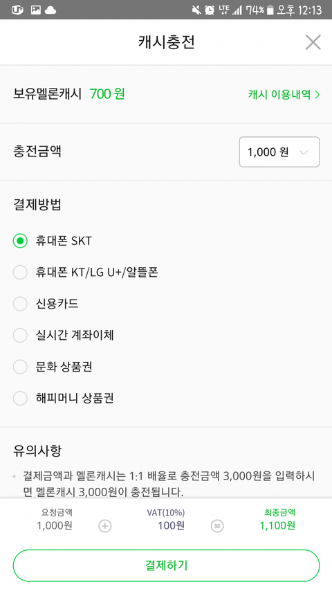 저러면 충전할수있는 곳이 나옴 미니앨범 같은 경우는 보통 곡 4곡정도 하니까 한곡당 700원이니 3000원 충전해서 사면됨(1000원단위로 충전가능)