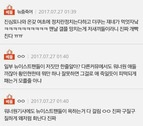 ㄴ 워너블들의 주작해서 올린 정치글 베댓
