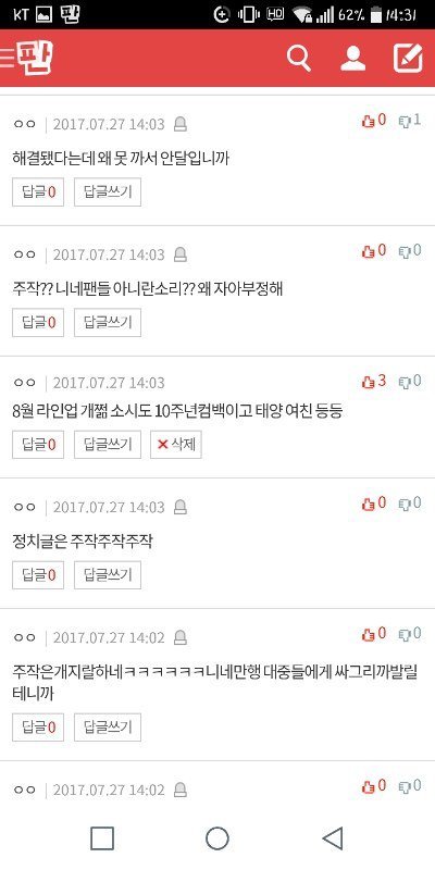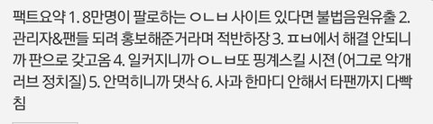 공식적인 사과를 해야 할 판에 글삭만 되었다고' 해결 되었습니다'는 조금이 아닌 많이 억지인 것 같네요 + 거기다가 몇몇 극성 분들이 병먹금, 그림으로 도배 후 왕창 삭제 반복을 어젯밤부터 계속하시는데 아무래도 톡선에 내려가서 이 사건을 묻히려는 수단으로밖에 안 보이네요
