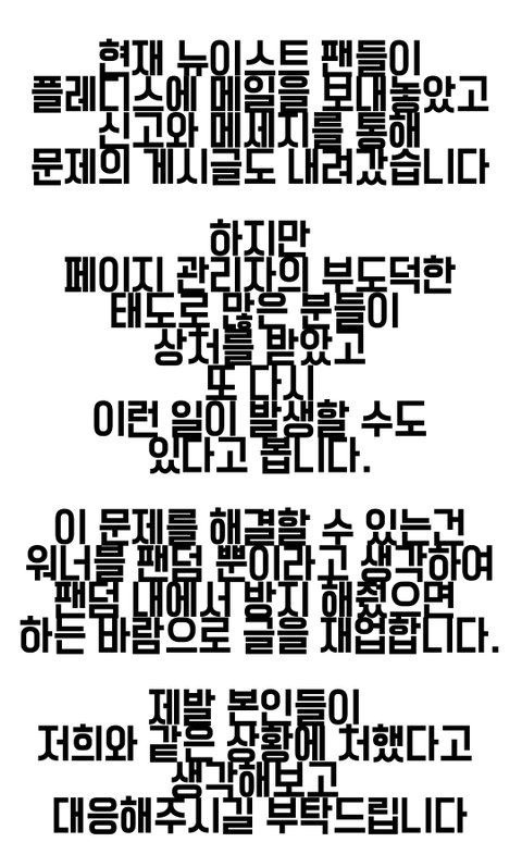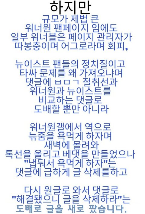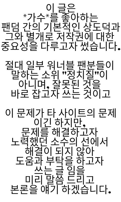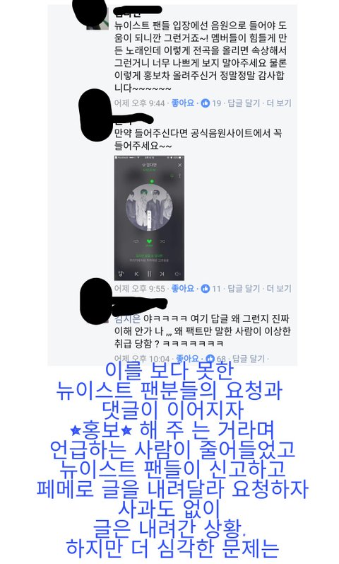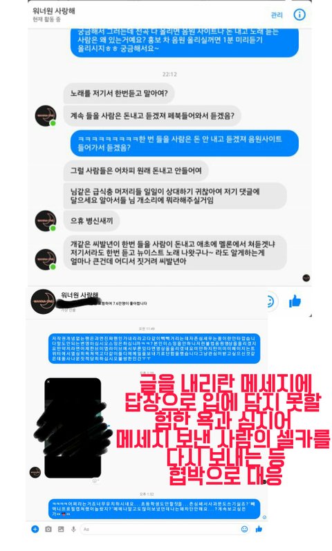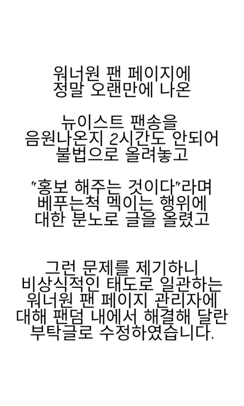 안녕하세요 글을 쓰기 앞서 저는 워너블 러브가 아닌 타팬이고요 제 본진을 언급하게 되면 역풍 맞을까봐 타팬인증 못한다는 걸 양해 바라고 이 팬덤이 이렇게나 악질적이고 공포의 대상이 됐음을 알리고 싶은 마음에 적게 되었습니다. 8만명이 팔로우하는 워너원 팬 사이트 ㅇㄴㅇ ㅅㄹㅎ가 7월 25일 발매된 뉴이스트w의 있다면 노래를 나온 지 2시간 만에 다운도 가능하게 불법 유출했습니다. 이에 문제를 가지고 뉴이스트 팬분들은 관리자들에게 이의를 제기했지만 돌아오는 것은 오히려 홍보해준 것이다 라는 반응 이었고요 대체 워너원 팬페이지에 왜 1분 미리듣기도 아닌 깔끔한 뉴이스트 음원을 홍보랍시고 올려 놓은건지 같은 아이돌 팬이 왜 불법음원에 당당한건지 정말로 이해가 가지 않습니다.