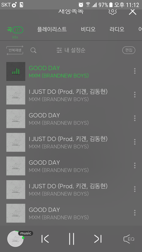 저장된거 다 지우고 난 두곡만 17곡으로 스밍 돌리고 이어폰 해놓고 계속틀어놓는데 맞니?