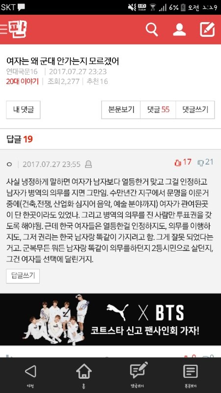 내가 아래 쓴글은 저 댓글에대한 글 뿐만이아니라 진짜 여자는 왜 군대안가냐하는 남자들의 말에대해서도 쓰는 글이야.