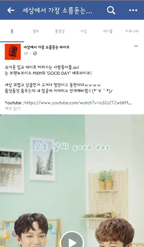페이스북 페이지 세상에서 가장 소름돋는 라이브 애들 GOOD DAY 라이브 영상 떴어요! 꼭 보고 좋아요랑 댓글❤❤❤❤❤ 둘 다 끼부리고 난리 났습니다 ㅎㅎㅎ