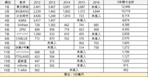 9위 엑소 16억 500만엔(162억원)