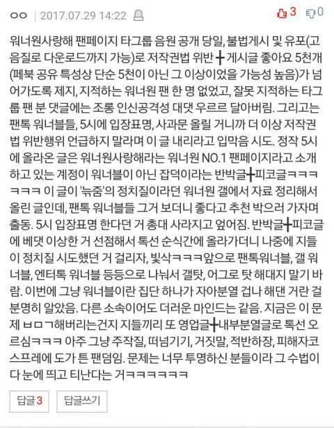 진짜 제가 죄송해요 전 위에 댓글에 전적으로 동의하고 사과를 해야한다고 생각하는 사건인데 어쩌다가 이렆게 됐을까요 특히 저 정치질한다고 톡선글 쓴사람은 철판 깔았다고 생각합니다 이문제는 전적으로 ㅇㄴㅂ 잘못이에요 제 사과로 러브분들의 마음이 풀린다고 생각하지 않지만 진짜 미안해요 계속 머리채 잡히는것도 죄송하고 그것으로 인해서 상처받는것 미안해요....전 이사건 전에 있던 큰사건으로 탈커뮤 했고 ㅇㄴㅂ 사표쓴 사람입니다 저도 더이상 이팬덤 하는짓을 못보겠어요 진짜 미안해요