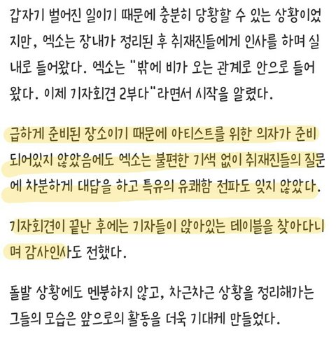 엑소는 컴백 기자회견에서 궂은 날씨에도 너스레를 떨며 분위기를 풀으려 애썼고
