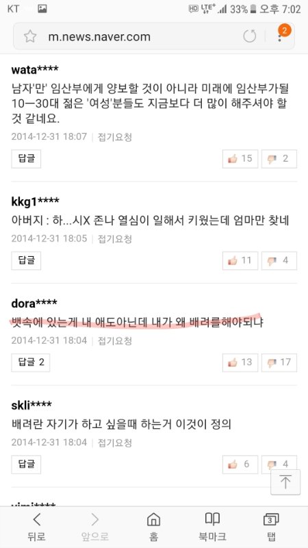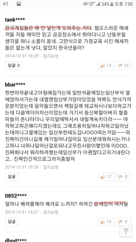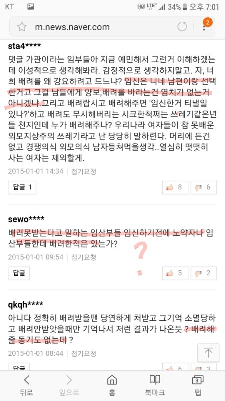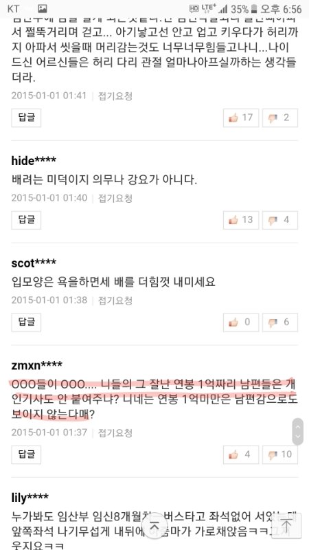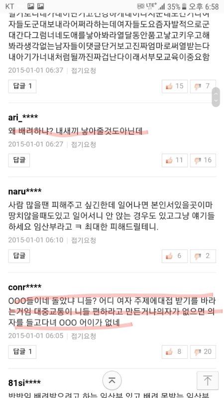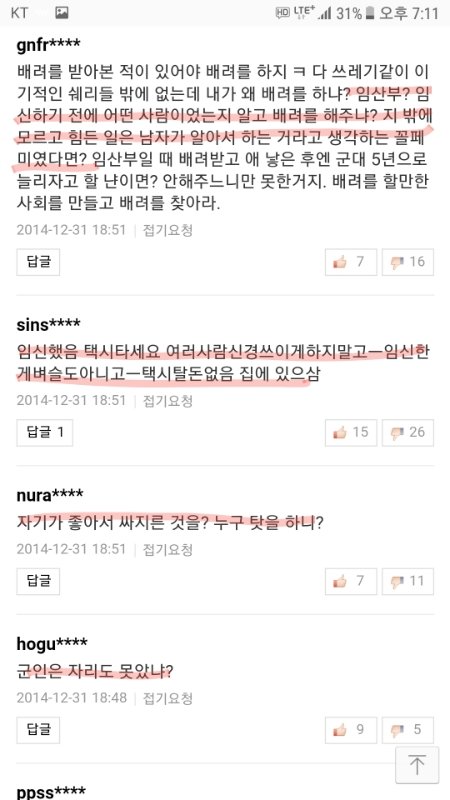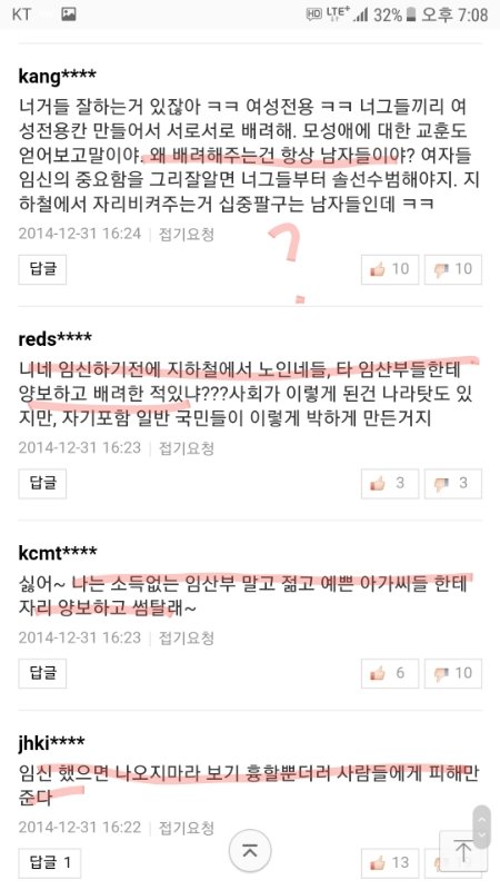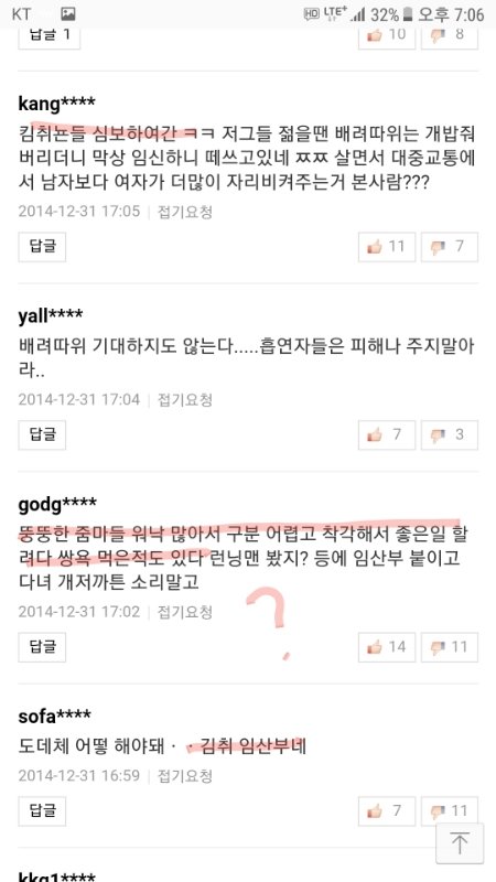 임산부 자리양보 기사에 달린 여혐댓글들임.