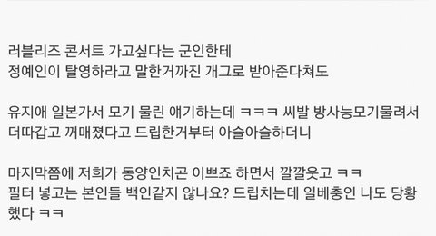 예인이 탈영은 드립이 아니라 그 브이앱에서 질문중에 콘서트 가고 싶은데 군대간다고 하니까 예인이가 휴가때 나올수 있지 않을까 얘기하니까 지애가 요즘 휴가 받기도 힘들지 않냐고 하니까 예인이가 탈영할순 없으니 어쩔수 없이 러블리너스인 친구한테 후기를 듣는걸 추천드린다. 뭐 이렁건데 탈영을 추천했다니.... 그 브이앱 본 팬으로써 어이가 없다,,
