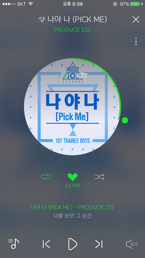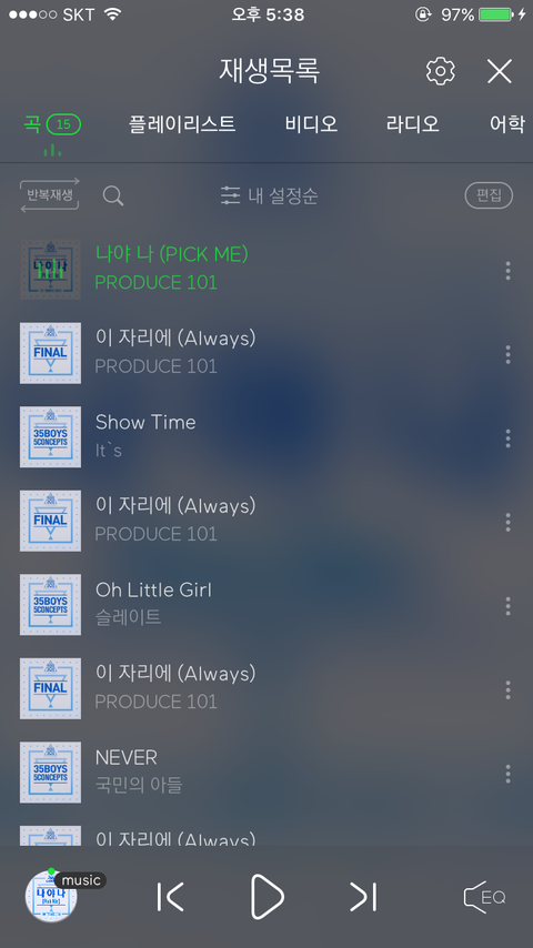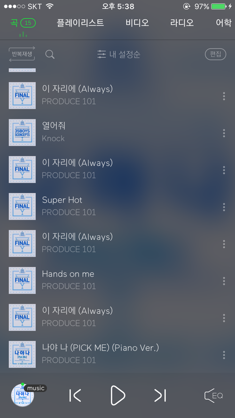 리스트 순서랑 저거 전체재생??이랑 하트 이렇게 하고 듣는거 맞아??