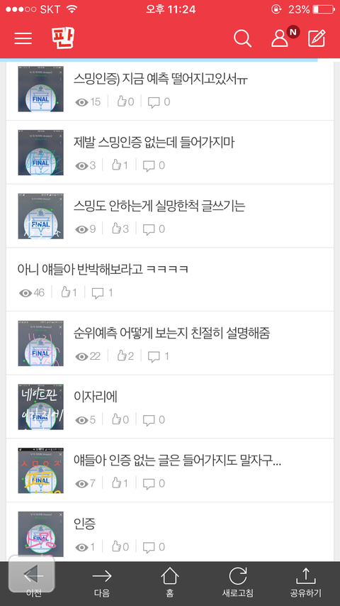 왜 인증없는 딱봐도 어그로인글이 인증글보다 조회수가많은데 ㅋㅋ 장난하냐 좀 들어가지말라고